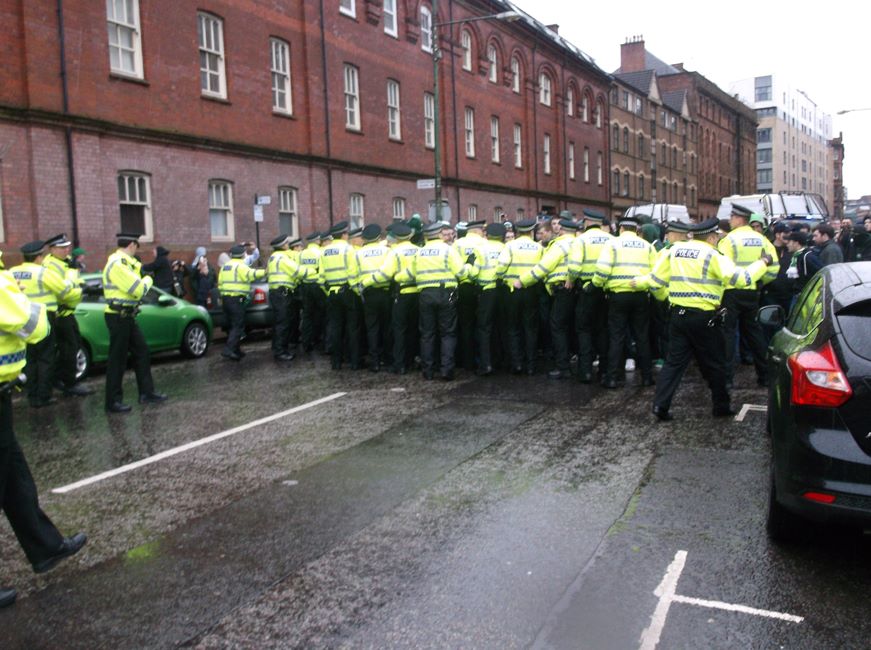 There are a number of things that those who are bending over backwards to defend the police action on Saturday are missing and I am addressing this to LW’s comments as a good example of what appears to be a reasonable argument but which is fundamentally misleading. If there was to be an unlawful march, well publicised in advance, then lets think about how the police have handled similar situations in the past: on 29th October 2011, there as a FAC rally in George Square. The police asked us to come in and speak to them – we didn’t approach them first. They asked if there would be a march and we said nothing was planned but you would have large numbers of people leaving George Square and heading to CP so it would be observationally equivalent. In the end the people did march on the road and the police simply guided it to Celtic Park – no arrests, no disorder, no batons. They chose not to do take the same approach on this occasion. Why?